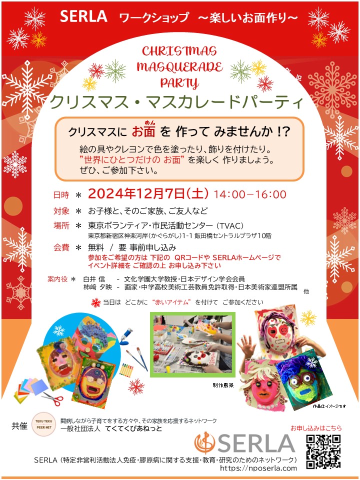 12月7日は、SERLAのワークショップに参加して「お面作り」に没頭してみてはいかがでしょうか?きっと日々のつらいことや嫌なことを忘れられる時間になるのではないかと思います。