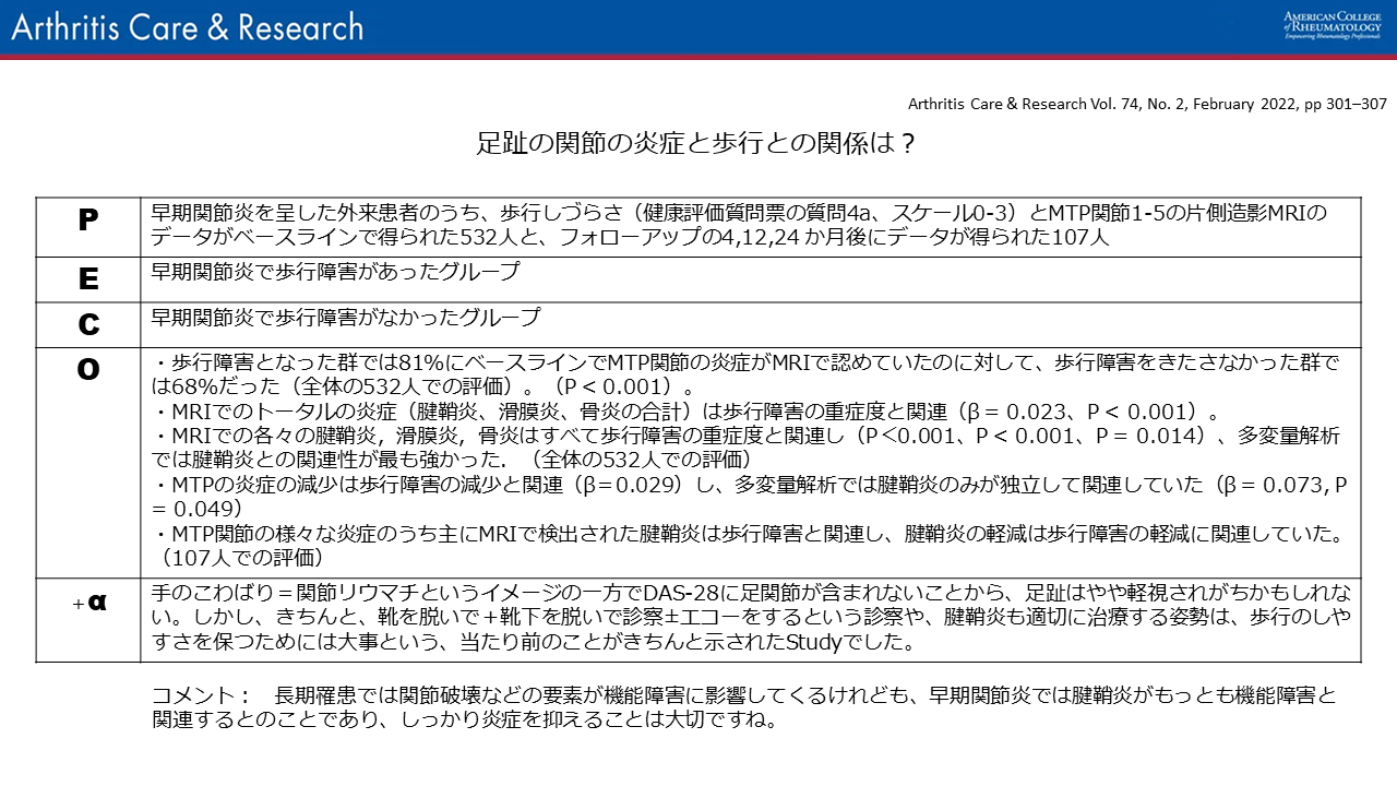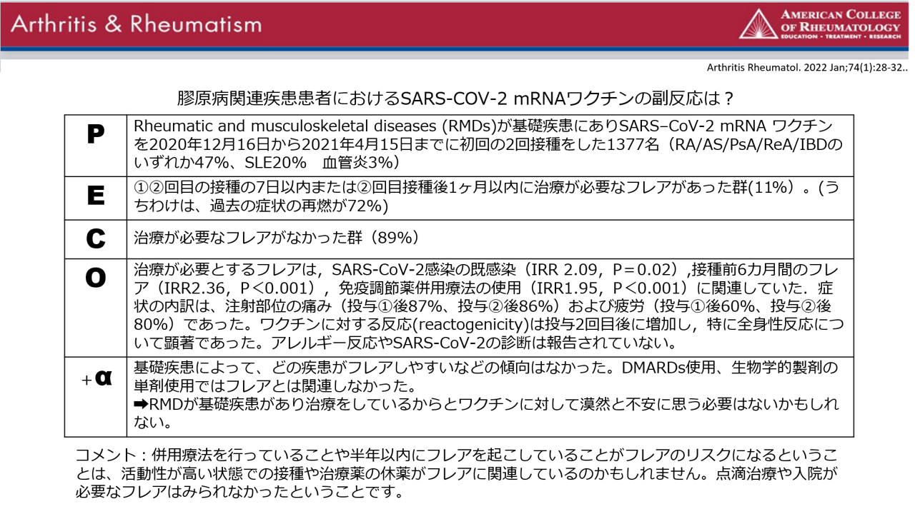 膠原病に関する論文を臨床の疑問にどういう PECO (P:Patient (患者)、E:Exposure(介入) 、C:Comparison (比較対象)、O:Outcome (結果))で答えているのか、簡単に紹介するコーナーです。