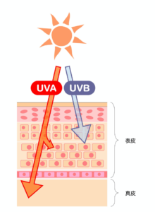 UVAは肌の奥深くの真皮まで届きますが、UVBは表皮まで届きます(下図)。
