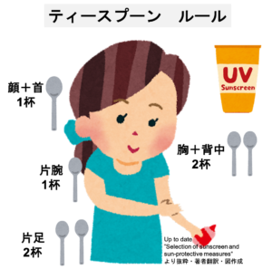 一般的には「ティースプーンルール」という小さじ1杯を目安に、身体の部位によって、下記のように塗ることがおすすめされています(7)。